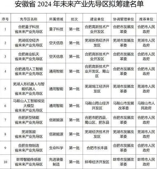 2024年9月,安徽省发展改革委公布了2024年省级未来产业先导区拟筹建名单,合肥共入选5个省级未来产业先导区。