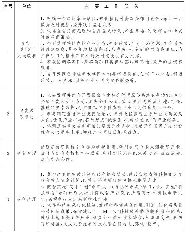 (一)开发建设。省政府办公厅(省政务服务办)会同省发展改革委、省商务厅等单位负责抓好落实,协调推进“招商一张图”平台总体建设,同步完善基础设施配套,优先保障平台所需算力资源及网络安全防护能力。收集省直有关单位涉及招商工作的业务需求,形成需求清单,制定整体建设方案,按照规定程序完成平台建设内容开发,编制并公布《“招商一张图”平台运行管理规范》。