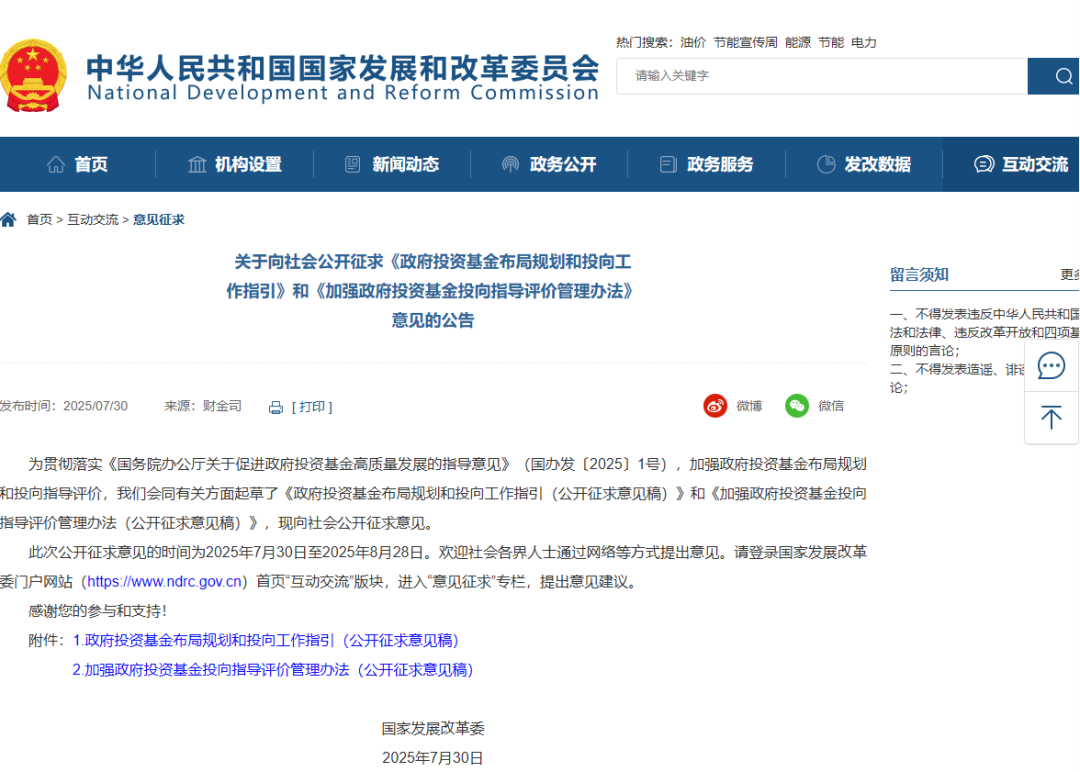 7月30日,国家发展改革委会同有关方面起草的《政府投资基金布局规划和投向工作指引(公开征求意见稿)》(以下简称《指引》)和《加强政府投资基金投向指导评价管理办法(公开征求意见稿)》向社会公开征求意见。公开征求意见的时间为2025年7月30日至2025年8月28日。