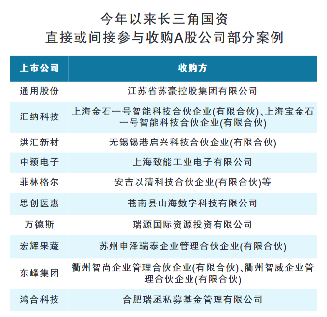 上证报记者统计发现,今年上半年发生的长三角国资收购案例中,跨省收购趋势显著。例如,江苏国资收购广东的海川智能与宏辉果蔬、安徽国资收购重庆的蓝黛科技、浙江国资收购广东的东峰集团等。