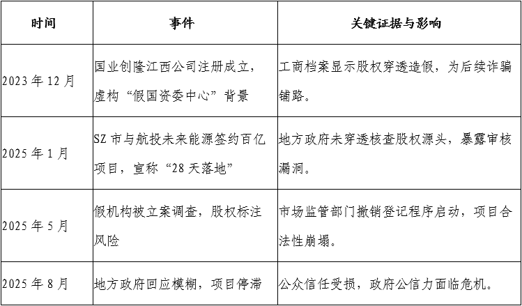 造假企业的核心操作主体(国业创隆江西公司)注册于江西上饶,项目落地于湖北SZ,两地监管信息完全割裂:江西上饶市监局2025年5月已接到举报、向国资委核实并立案调查,但未及时将“假国企”风险信息推送至湖北;SZ高新区直至2025年6月仍将项目列为“省市重点”,甚至发布招标计划,8月媒体追问后才启动核实,3个月的信息差让地方错失止损良机。