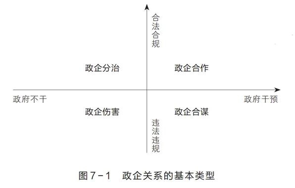 右上角是政企合作,表示政府深度干预企业的生产或经营活动,同时政府和企业的互动行为都符合法律法规;左上角是政企分治,表示政府和企业互不相干,各自守法,极端情况是政府“无为而治”;左下角是政企伤害,包括政府单方面伤害企业,企业单方面伤害政府,政府和企业相互伤害;右下角是政企合谋,表示政府深度干预企业的生产或经营活动,同时政府和企业之间通过违法或违规的方式进行利益交换。