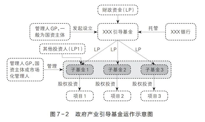 这种模式具体来说,就是政府用财政资金加上国有资本,成立所谓的产业引导基金。在基金中,提供财政资金的政府机构一般是担任LP(有限合伙人),负责基金运营的机构担任GP(普通合伙人),一般是国资机构,也可以是市场化机构。产业基金再通过子基金将资金投入具体项目。[1]