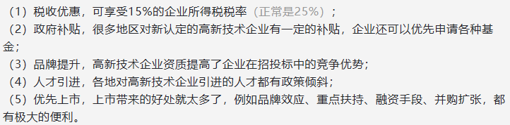 我在山东一个地方调研时,当地一个常务副区长跟我说,现在招商引资竞争太激烈了,企业除了土地、税收之外,非常看重你当地能不能帮它申请到高新技术企业或者专精特新“小巨人”企业认定。那么,企业申请到这些荣誉称号有什么好处呢?以高新技术企业荣誉为例,通过认定之后,有如下好处: