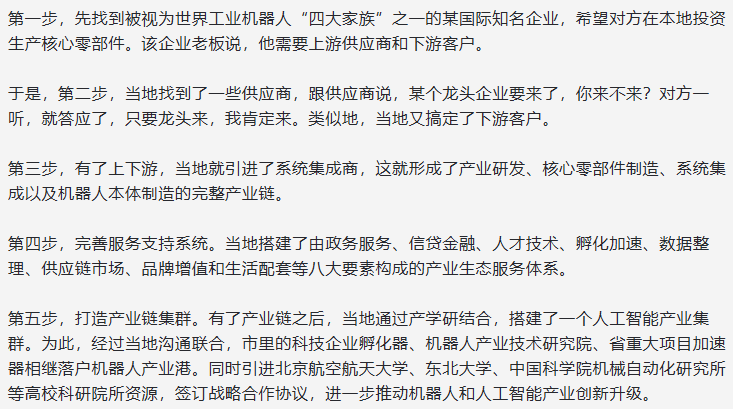 2020年前后,我在一个地方调研时,某县负责招商的产业园区负责人给我讲了当地如何成功打造了一个“机器人产业港”。
